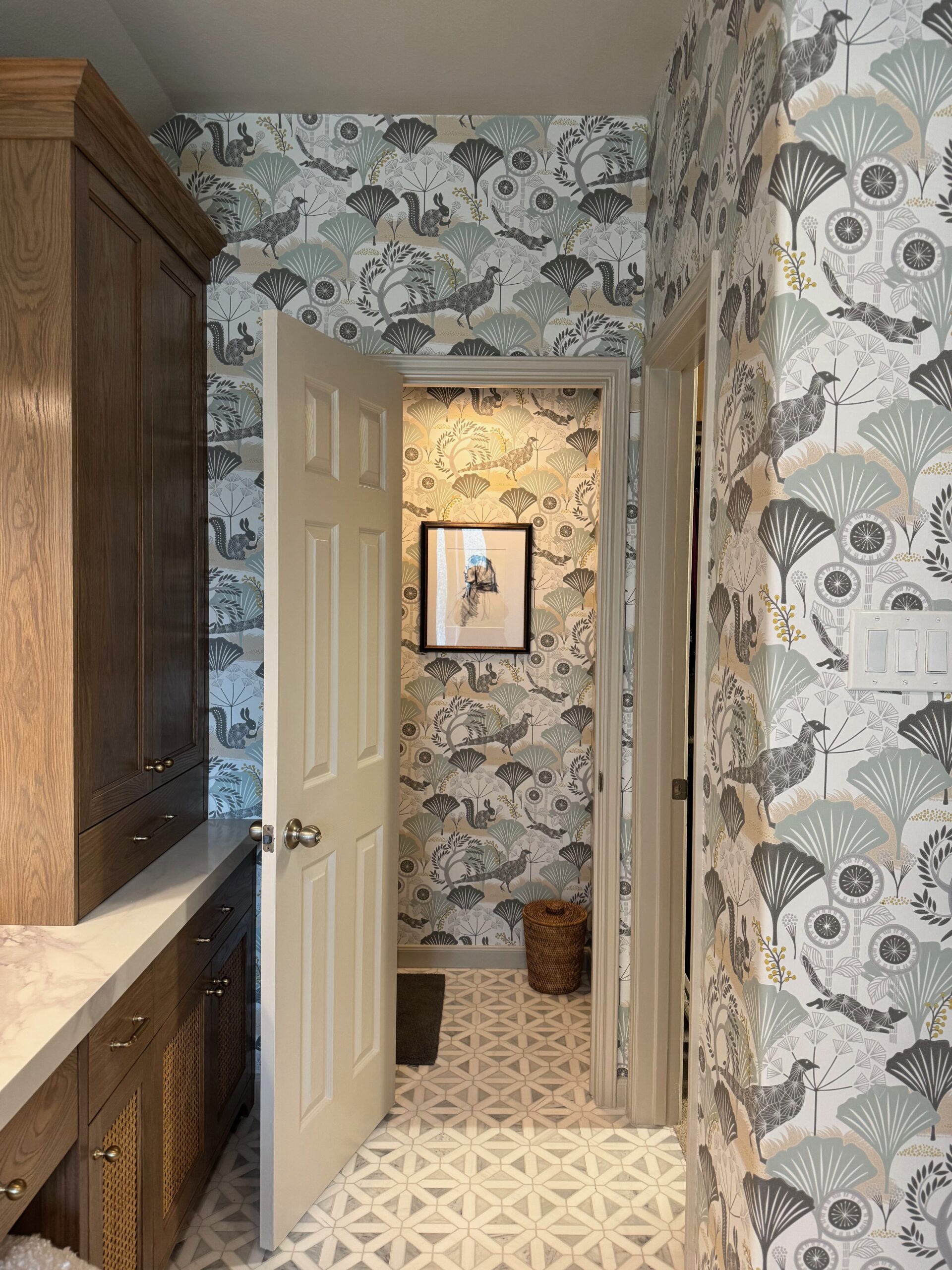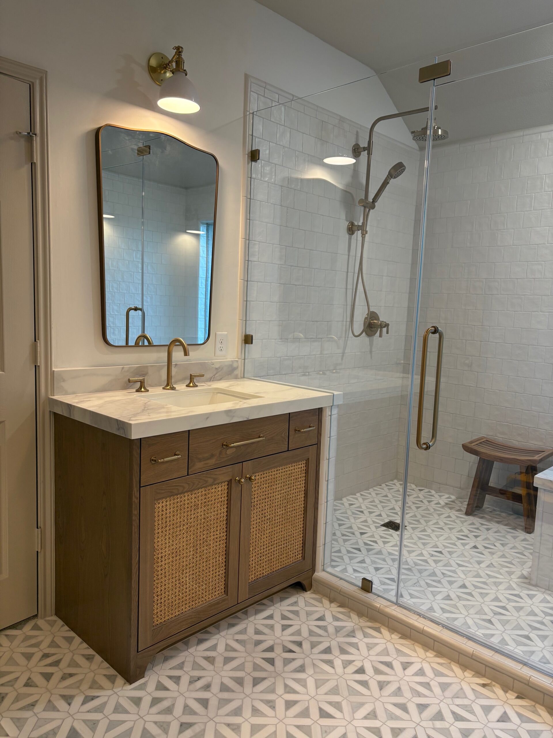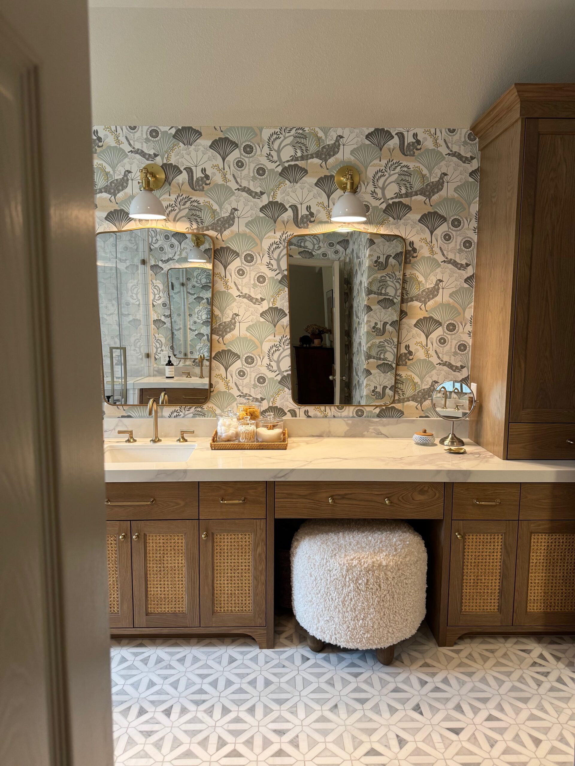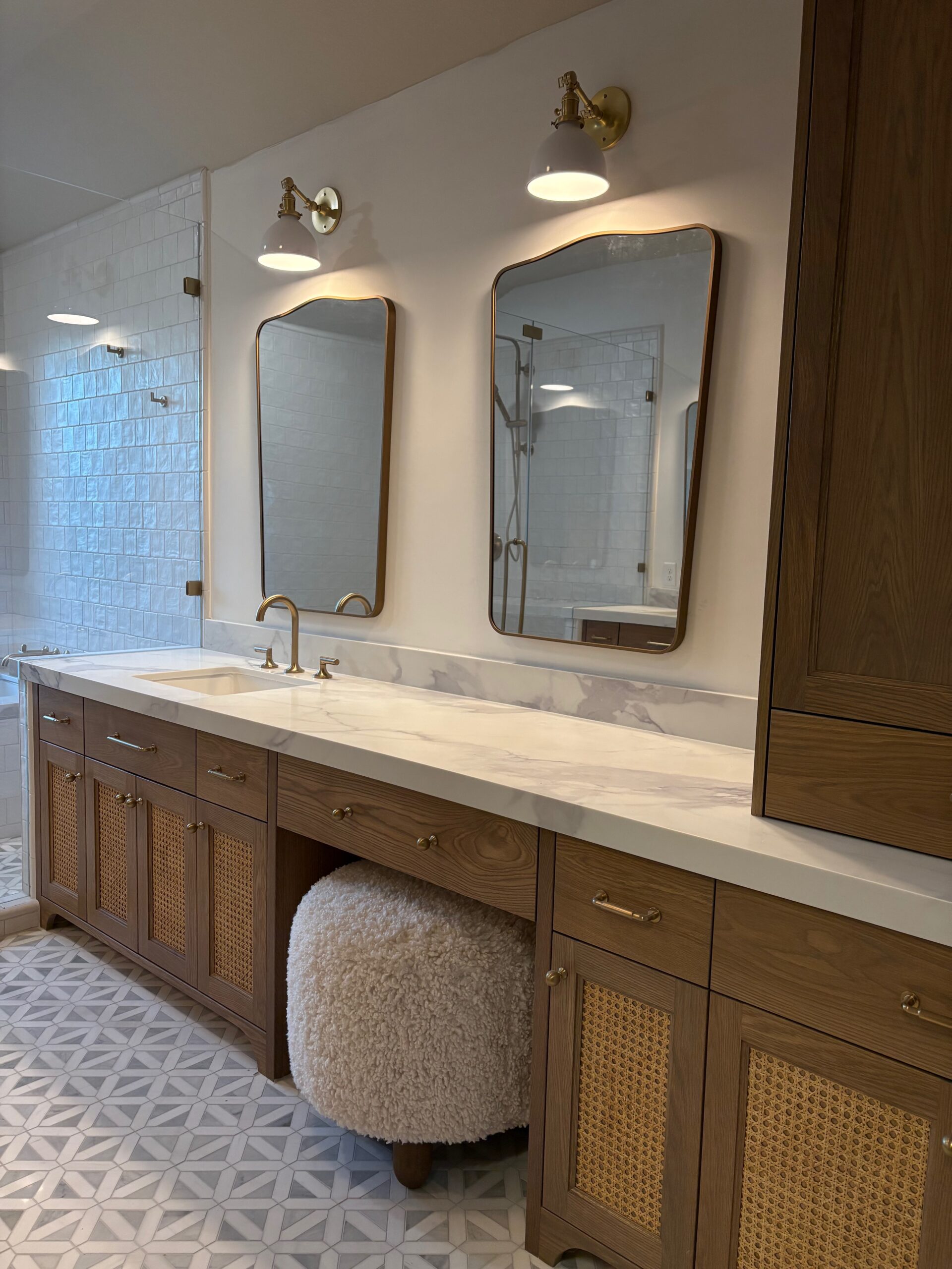 A serene, spa-inspired primary bathroom featuring custom white-oak cabinetry with woven cane panels, marble countertops, and statement wallpaper. The expansive glass-enclosed shower, marble floor tile, and brass fixtures create a bright, elegant space. Thoughtful details like dual mirrors, warm sconces, and a cozy vanity stool add both luxury and comfort, making this bathroom a perfectly balanced retreat.