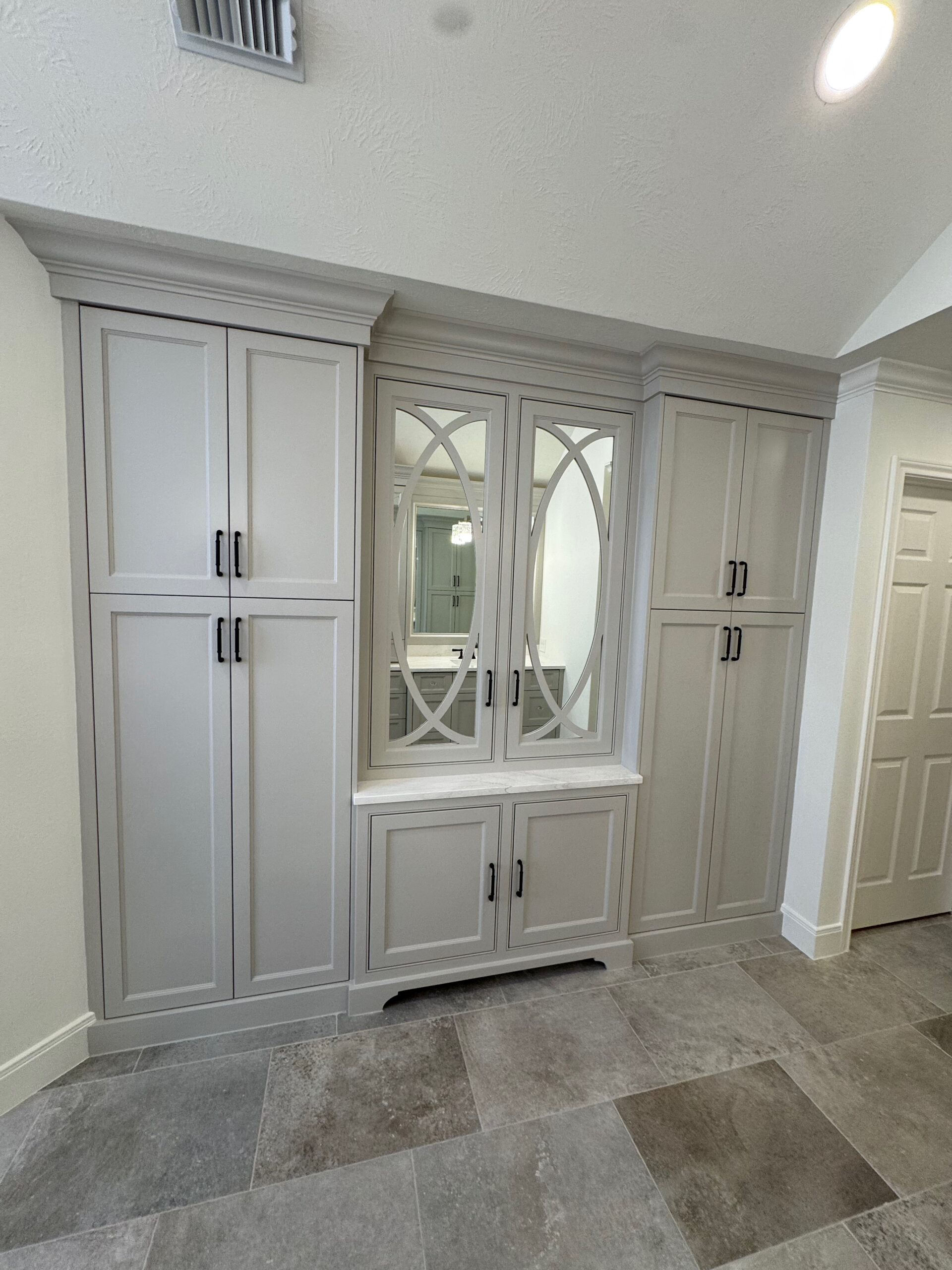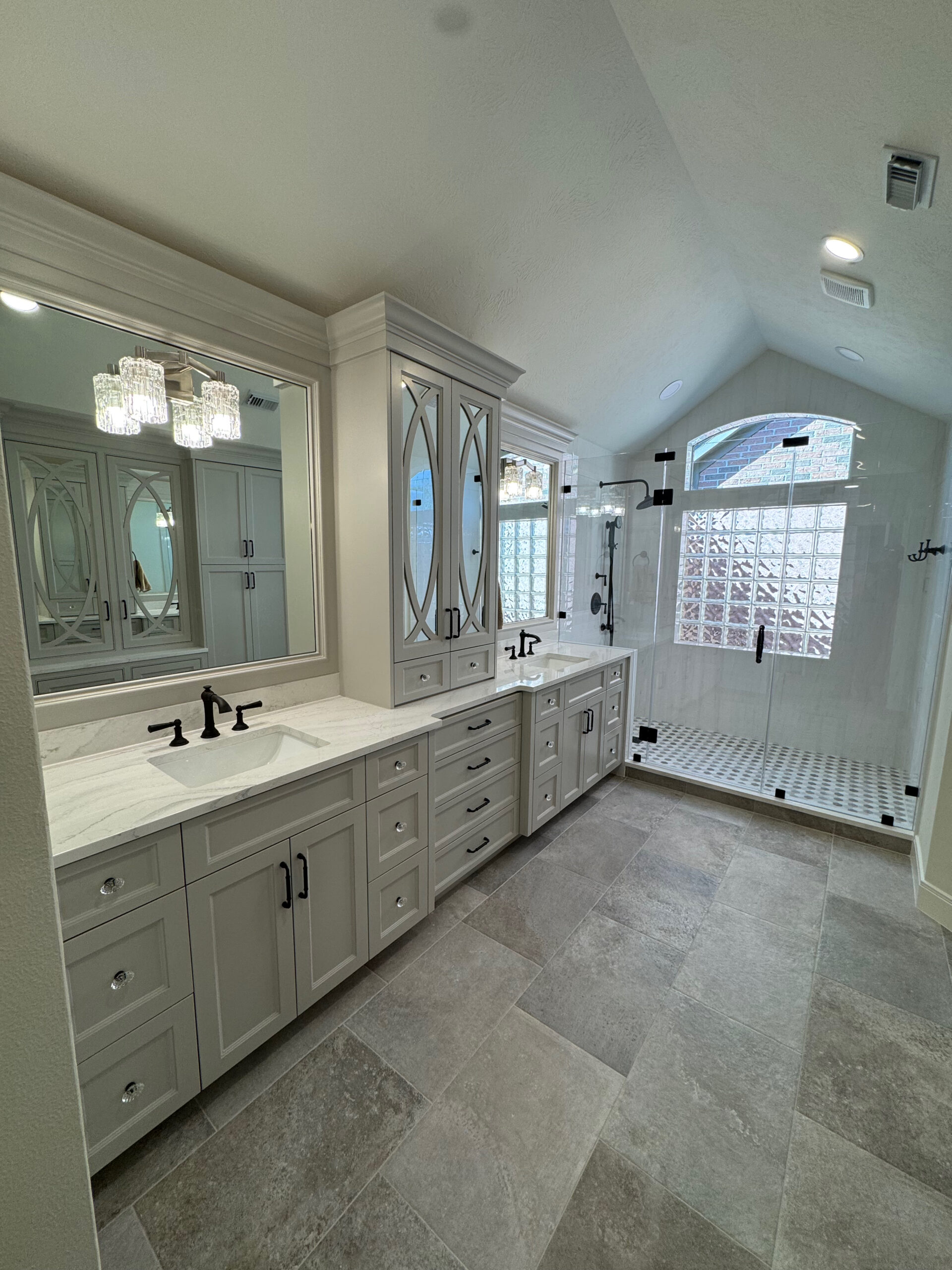 A bright, timeless primary bathroom designed with custom cabinetry, clean architectural lines, and a calm, spa-like feel. The space features full-height custom cabinets for maximum storage, elegant mirrored center cabinetry, and a double vanity topped with quartz countertops. The large glass-enclosed shower with dark oil rubbed bronze hardware, patterned tile floor, and abundant natural light creates an open, airy atmosphere. Thoughtful details like crown molding, soft neutral finishes, and statement lighting bring both function and refinement to this beautifully updated retreat.